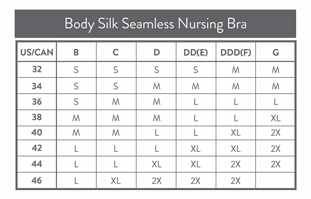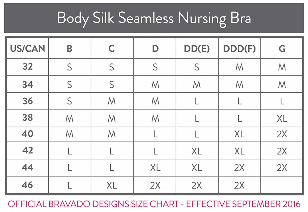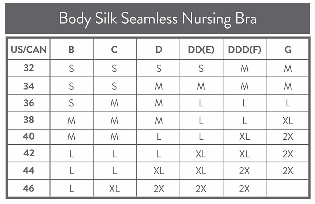 Bravado Style 1401. Molded soft cup bra. Stretch nylon blend. Easy-to-reach and open nursing snap down clips. Wide underband to support busts. Satin trim along bustline. Foam-lined cups for modesty. Convenient front-adjustable straps. 4 column, 3 row hook and eye back closure. Specifically designed for nursing mothers. The Body Silk Seamless Nursing Bra was designed to melt onto your body, and give you comfort unlike any you’ve experienced from a bra before – nursing or not! This bra has been worn by many celebrity BravadoMamas, including Jennifer Garner. Simple sizing system that makes this bra perfect for any stage of pregnancy or nursing, to comfortably fit your changing shape each step of the way. This sizing system also makes this bra ideal for baby shower gifts, new mom gifts, and gift registries; since you can easily guess her size (if you don’t know her bra size, choose the size she’d wear in a top, and if she’s in between; choose the larger size).