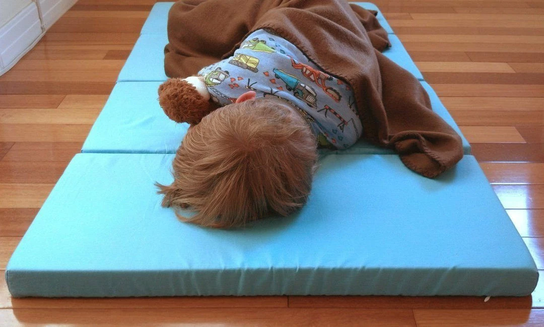 MamaDoo Kids Big Kid Sleep Mat… Overview: By far the most comfortable nap mat on the market. A real mattress that provides real support and comfort unlike other naps mats, which are basically a sleeping bag. Tight and strong hinge connectors that keep the Mattress from separating while in use… 4+ Smart Uses: On the floor as a bed, TV floor pad, play mat, even as a bench when folded… On the go: Perfect for sleepovers, camping, hotels, grandparent’s; and babysitter’s house, the beach, parks… Compatible With: Standard crib sheets fit perfectly… Dimensions: 50 x 26 x 1.5 inches (open position)