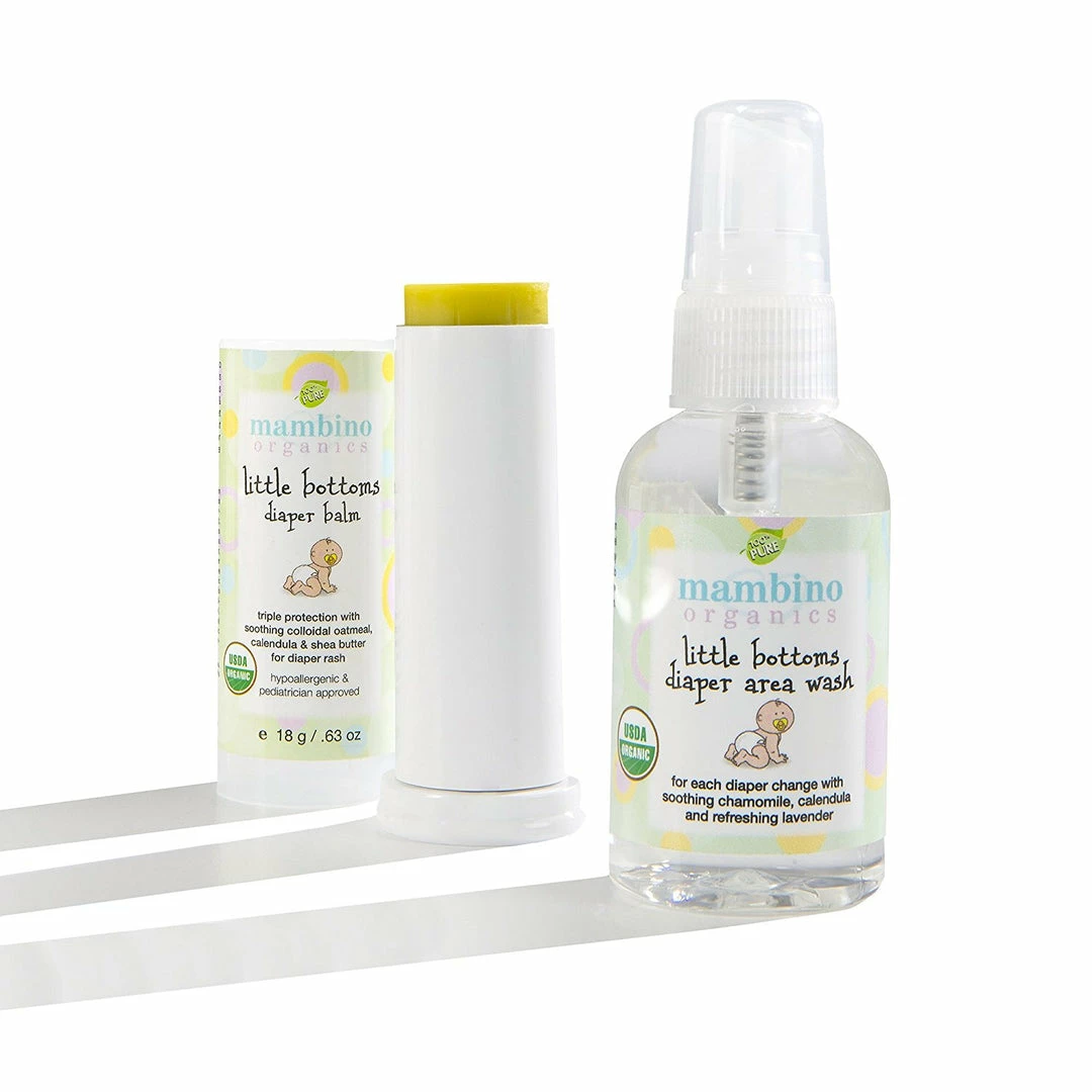 - PRODUCT SPECIFICATIONS: Package contains (1) Mambino Organics: Just Hatched Baby Arrival Kit, 5 piece. Includes Little Bottoms Diaper Balm (18 g / .63 oz.), Little Bottoms Diaper Area Wash (60 ml / 2 fl oz.), Tippy Toes Calming Baby Oil (60 ml / 2 fl oz.), Mild Baby Wash and Shampoo (50 ml / 1.70 fl oz.), and Organic Cotton/Hemp Wipes (8 x 8″).