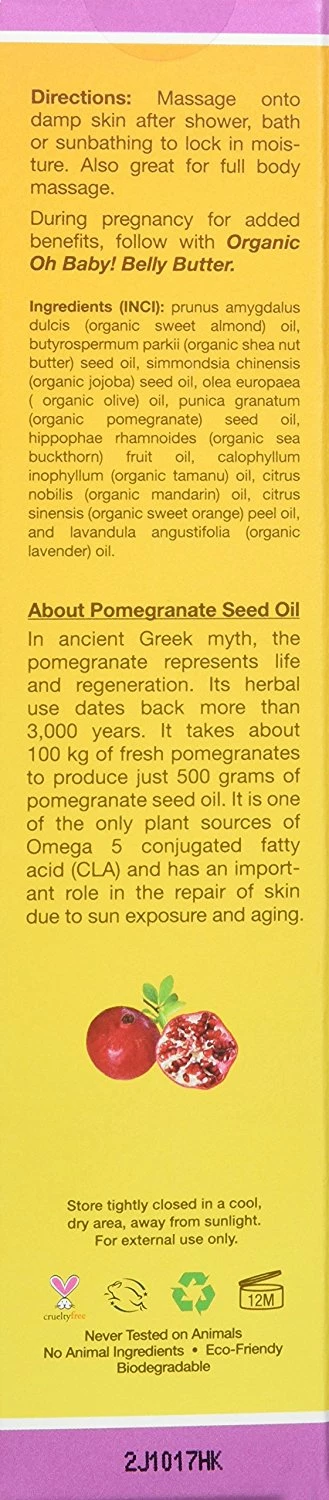- DIRECTIONS FOR USE: Massage onto damp skin after shower, bath and sun bathing to lock in moisture. During pregnancy, for optimum benefits, follow with Organic Oh Baby. Belly Butter. It help improve skin tone and elasticity during pregnancy, leaves skin soft and supple, superior hydration that lasts all day, helps prevent premature signs of aging, and safe and highly effective to prevent stretch marks.