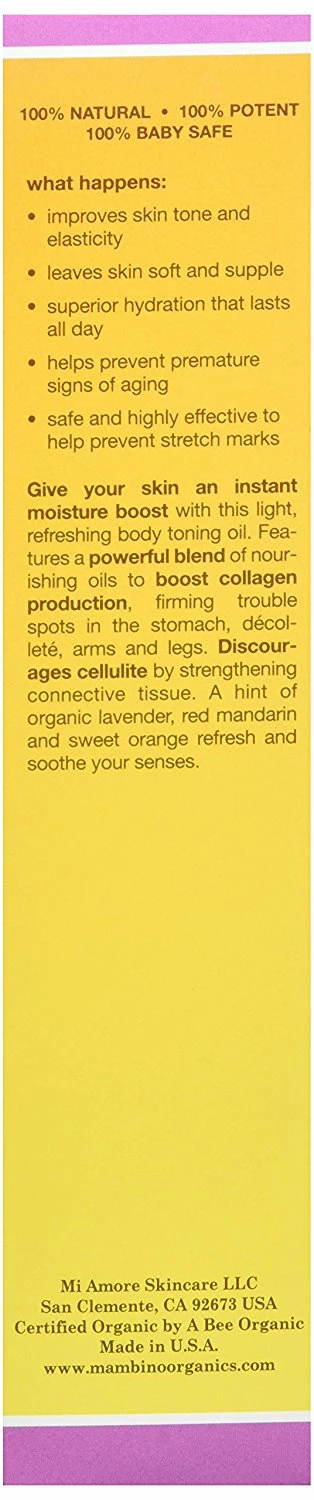 - PRODUCT SPECIFICATIONS: Package contains (1) Mambino Organics Moisture Me Body Toning Oil, USDA Certified Organic. Pomegranate Oil revitalizes skin tone and elasticity. Shea Oil rich in EFAs, penetrates deep to hydrate. Jojoba Oil seals in moisture. Sea Buckthorn fruit oil restores skins elasticity.