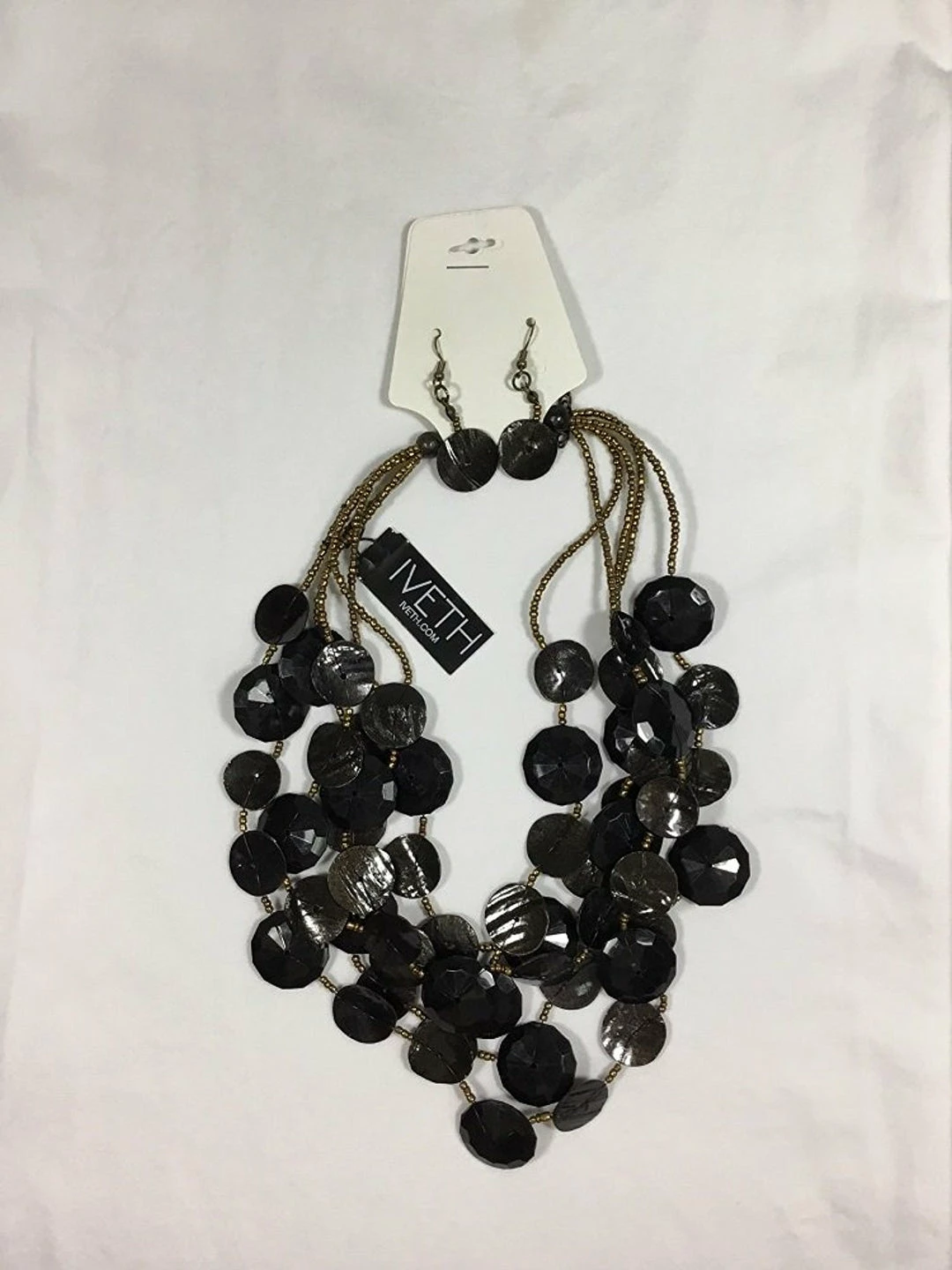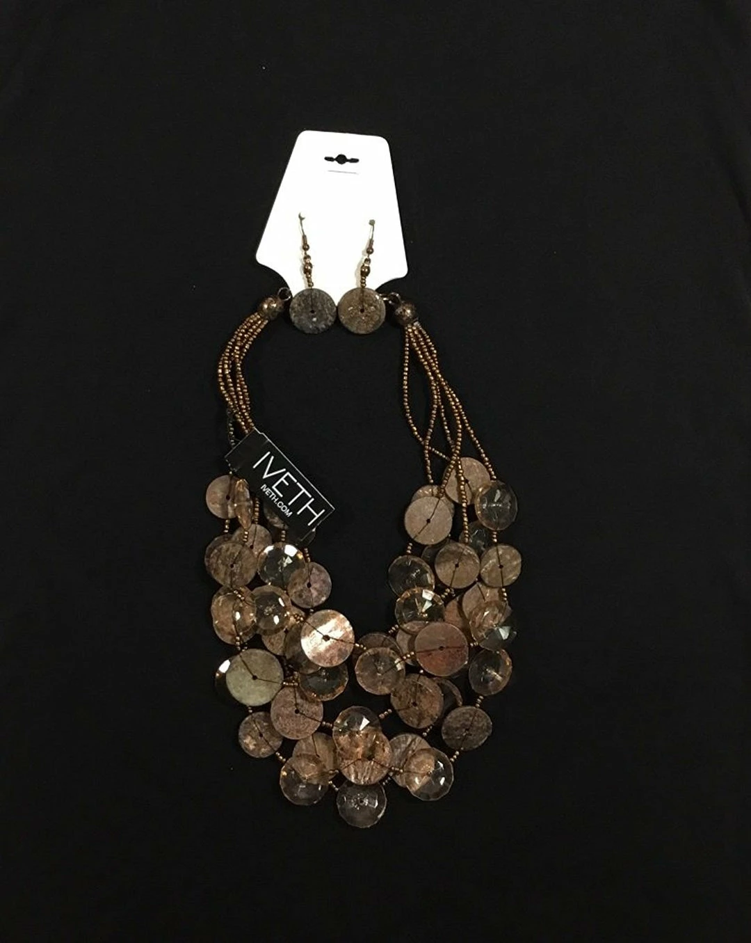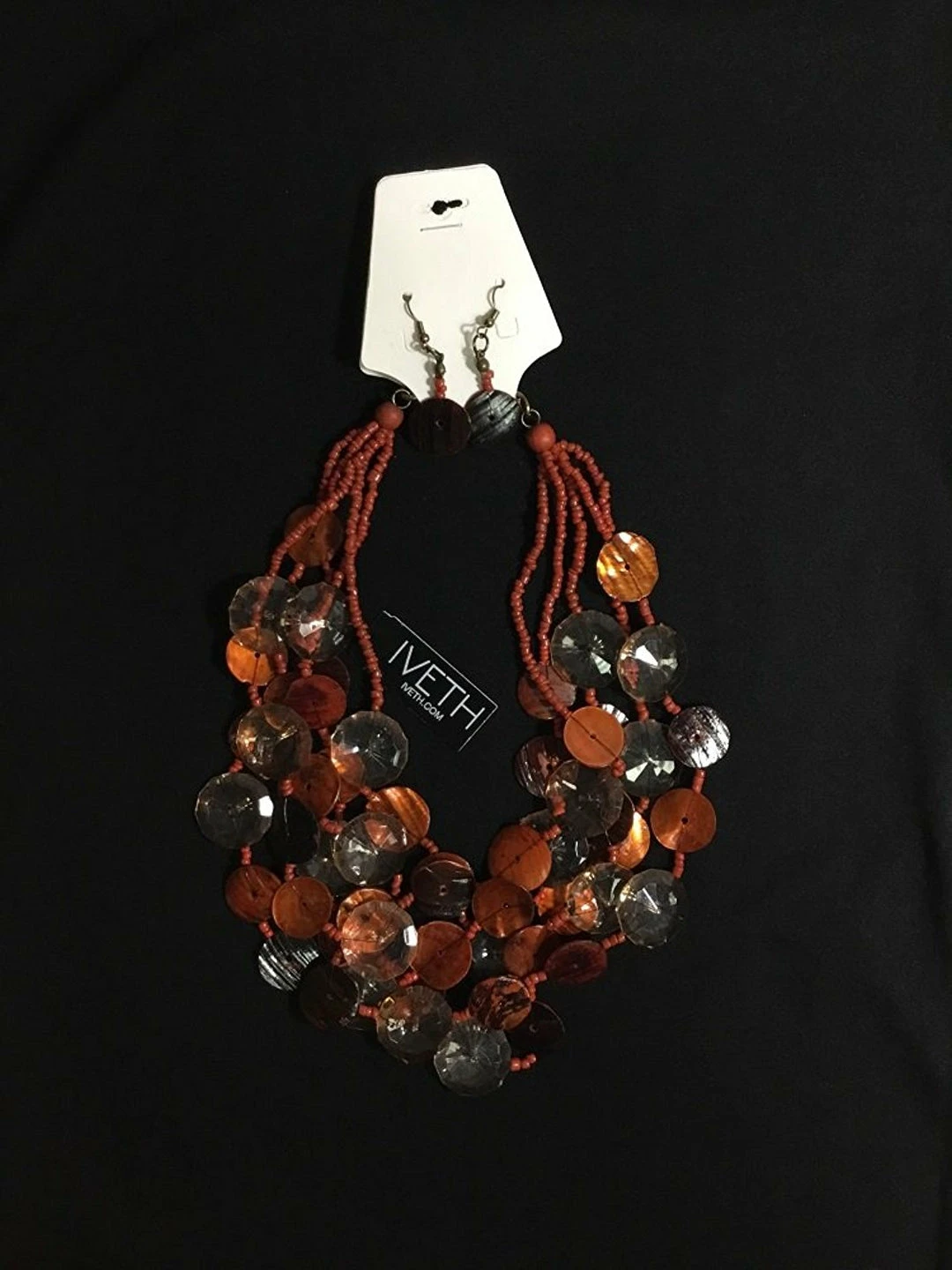 A beautiful necklace with many different colors makes it easy to match with almost any color outfit. The five strands are all at different measurements giving it a layered effect, this effect adds boldness to your look. Add this gorgeous necklace and earrings to your outfit and watch your look change. It is composed of shells and multicolored resin details. Wear it with a cute tank top on a warm day or wear it with a blazer for a more sophisticated look.