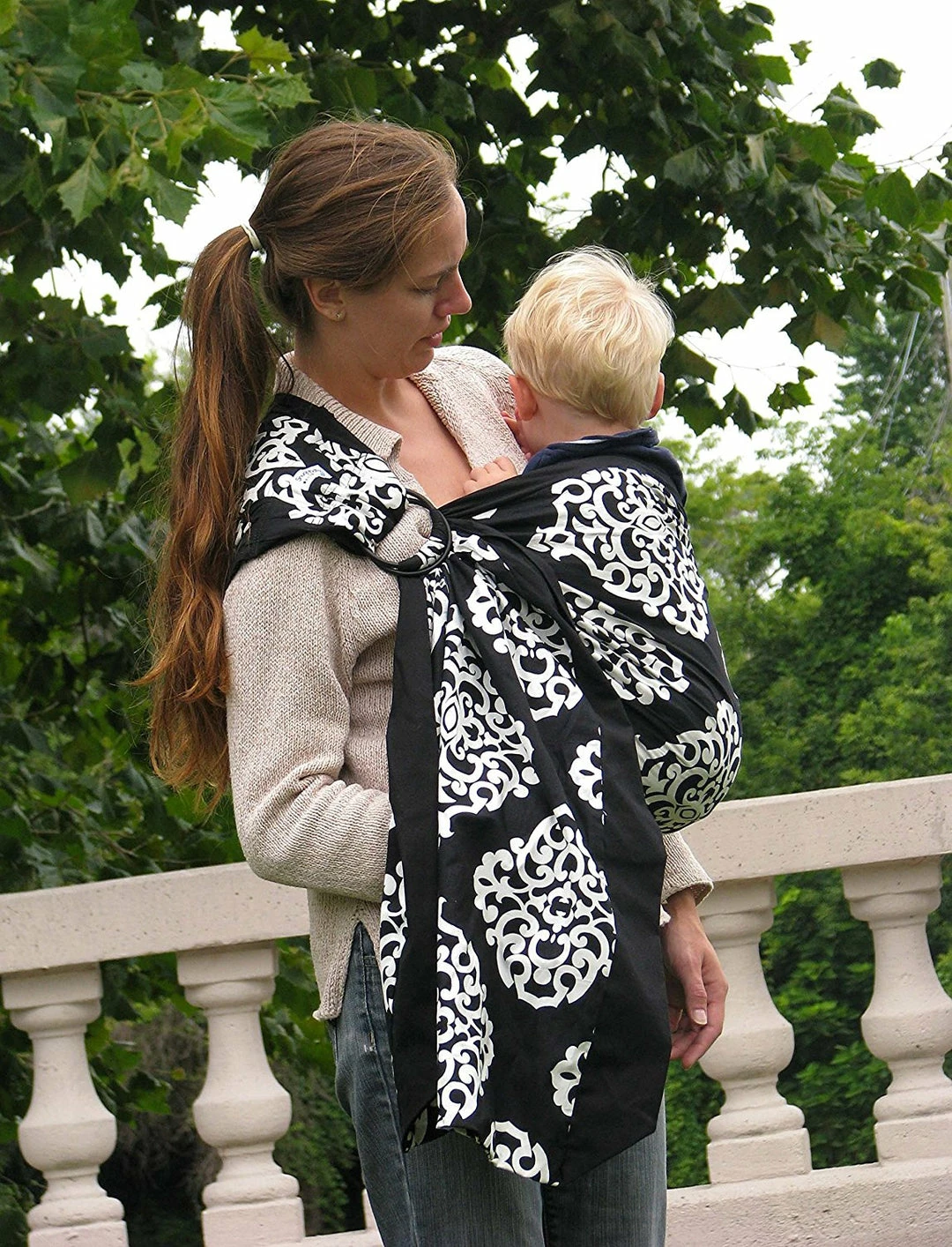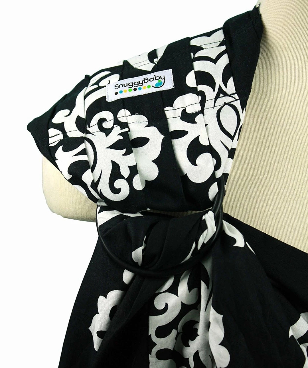 very Baby Needs a Sling and Every Mom Deserves One. Snuggy Baby Prestige ring slings are made with 100% cotton to ensure comfort for mom and baby. They are made of 2 layers of fabric to be stronger and more secure while carrying your baby without overheating him/her. The 2 layers of fabric provide a uniform print no matter what part of the ring sling is showing. The prestige line is a wider sling with bold rails to add a dramatic visual affect and make it easier to find and adjust your rails. The open tail of the baby sling can be used as a great cover to provide protection from the sun, wind, or rain. It also provides excellent coverage as a nursing cover allowing for discrete nursing in public. The shoulder of this baby sling is pleated to decoratively provide even distribution of your baby’s weight without bunching or cutting into your shoulder. The aluminum rings are secured with double stitching to ensure the security of your baby. I exclusively use SlingRing rings which are specially designed for baby wearing and are designed to be lightweight and free of welds. Snuggy Baby slings are 100% adjustable so they work for multiple caregivers, making it easy for everyone to enjoy the benefits of baby wearing. You adjust the baby sling to fit you, so no matter what your body type is you can get a custom fit every time. As your baby grows, you will continue to adjust your baby sling for the perfect fit. You never need to worry about needing a larger size. Snuggy Baby slings measure approximately 2 1/3 yards long x 28 inches wide. This is a wider sling and perfect for larger babies. It provides a deep secure pocket for newborns and still provides plenty of support for a wiggly 3 year old. All of my baby carriers come with an instructional DVD. You can also find the instructional videos by clicking “Carry Positions” at the top of this page.