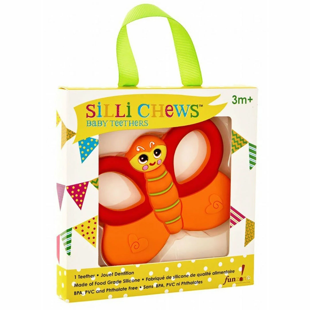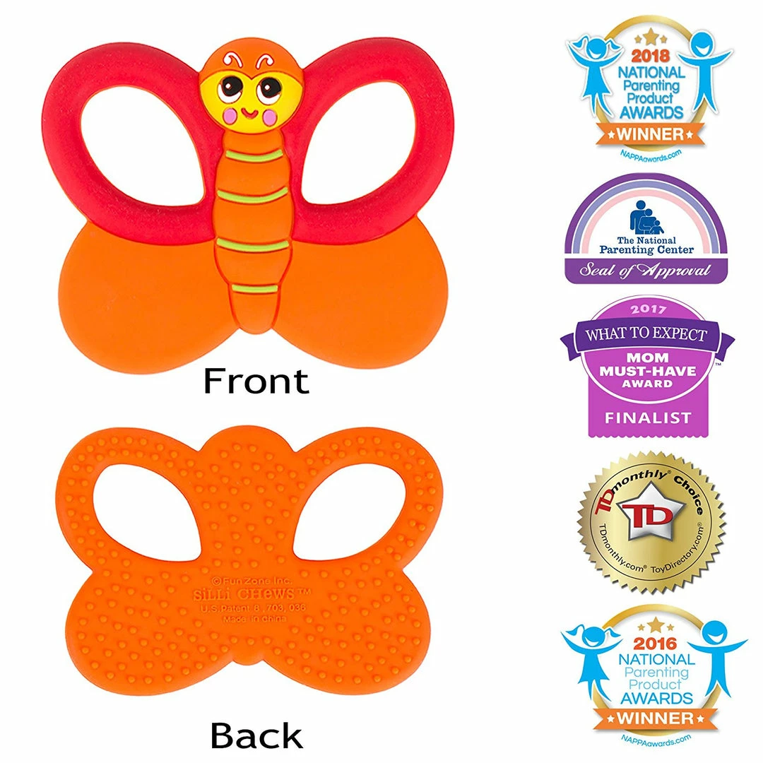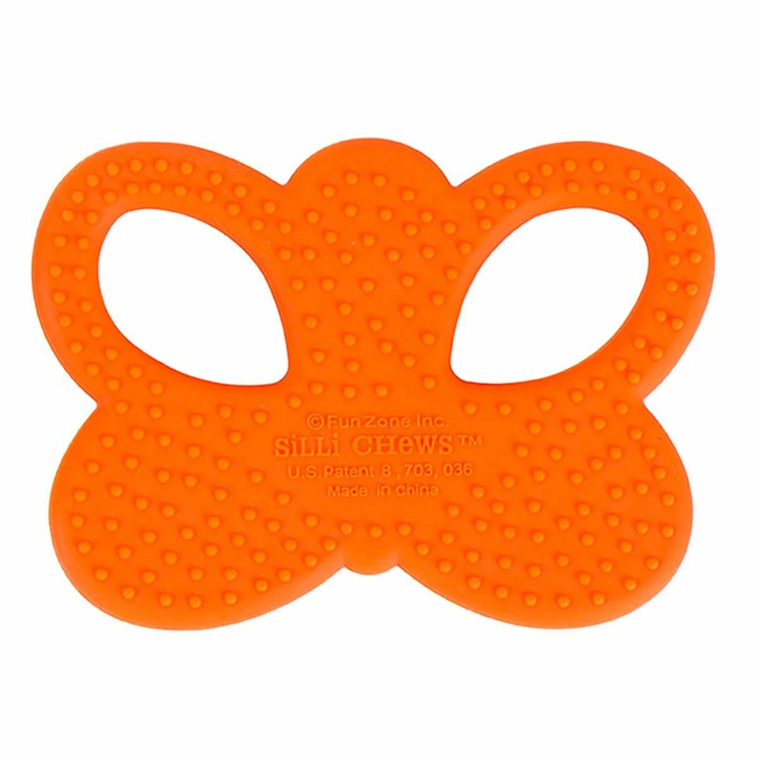 Color:Flutter Butterfly WHY SILLI CHEWS: add a little “silli”ness to teething. Silli Chews teethers are handmade for all stages of the teething process and feature sweet, playful characters and fun everyday objects in vibrant, eye catching colors. These original silicone teether designs will simultaneously “soothe and amuse” your babies.TEXTURED SURFACE: Silli Chews baby teethers have soft, flexible, and multi textured surfaces to aid with teething and soothe sore gums. Each multi-dimensional silicone teether is great for tugging and chewing. Babies, infants, and toddlers all love chewing on Silli Chews teething toys. GUM SOOTHER: chill or freeze to sooth sore gums.BABY AND KID SAFE: Silli Chews teething toys are made from patented ALL food grade silicone. No paint is ever used. Each baby teething toy meets or exceeds CPSIA, ASTM and EN71 standards. Silli chews teethers are BPA Free, Phthalates Free, PVC Free, Latex Free, and Lead Free.EASY TO CLEAN: chew toys are top rack dishwasher safe or can be cleaned with soap and water.MADE FOR SMALL HANDS: unlike other baby teethers, Silli Chews baby teethers are lightweight and small enough for babies to hold. No-Throw Tether: teether toys work with most clip holders or pacifier tethers.Designed in the USA. Made responsibly in ChinaSILLI CHEWS: is a women run product development and production company that has been in the baby and children’s market for over 23 years. As moms in different stages of our kids’ lives we saw a void in the infant teether category. With their expertise in silicone and the baby market, and most importantly our jobs as moms, they collaborated and came up with their newest “baby” product “Silli Chews”. Silli Chews is the culmination of six years of research and development into the use of silicone in baby teethers. Fun Zone was awarded a US patent for their innovative manufacturing technique.