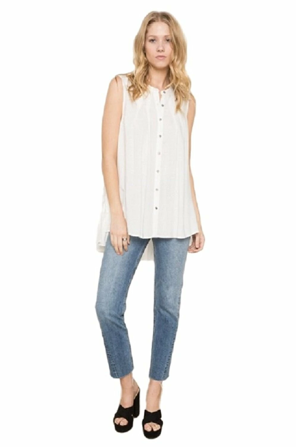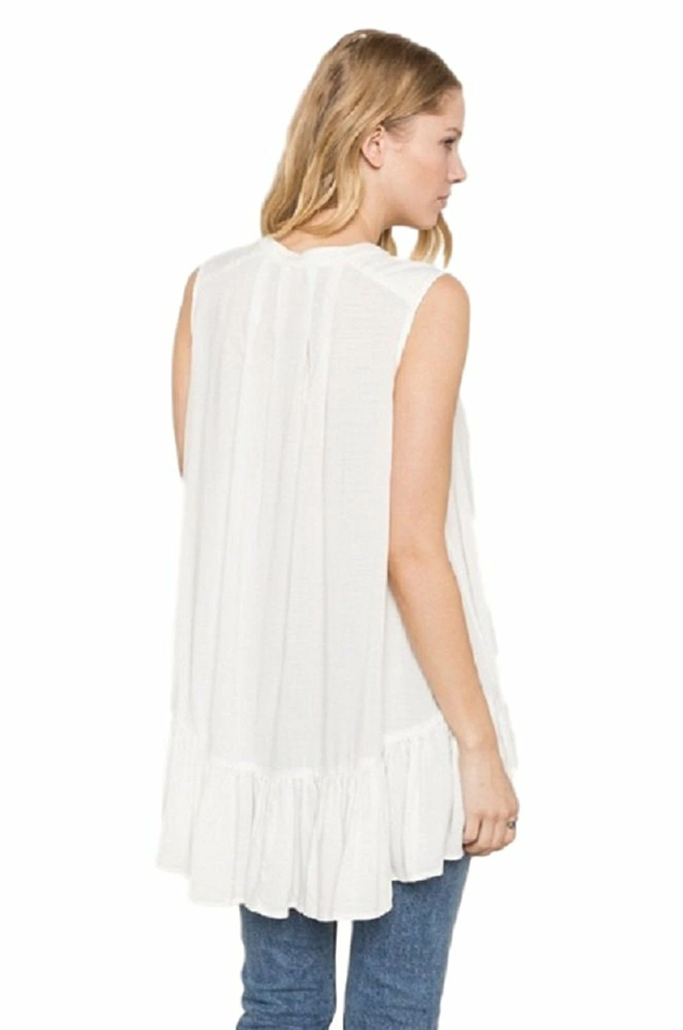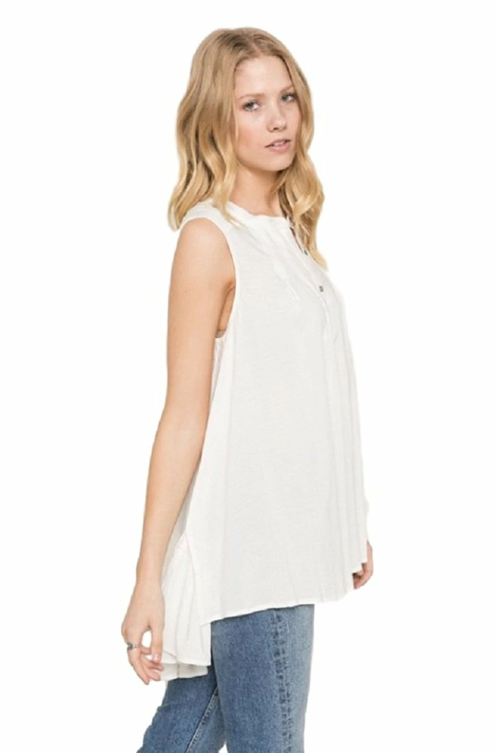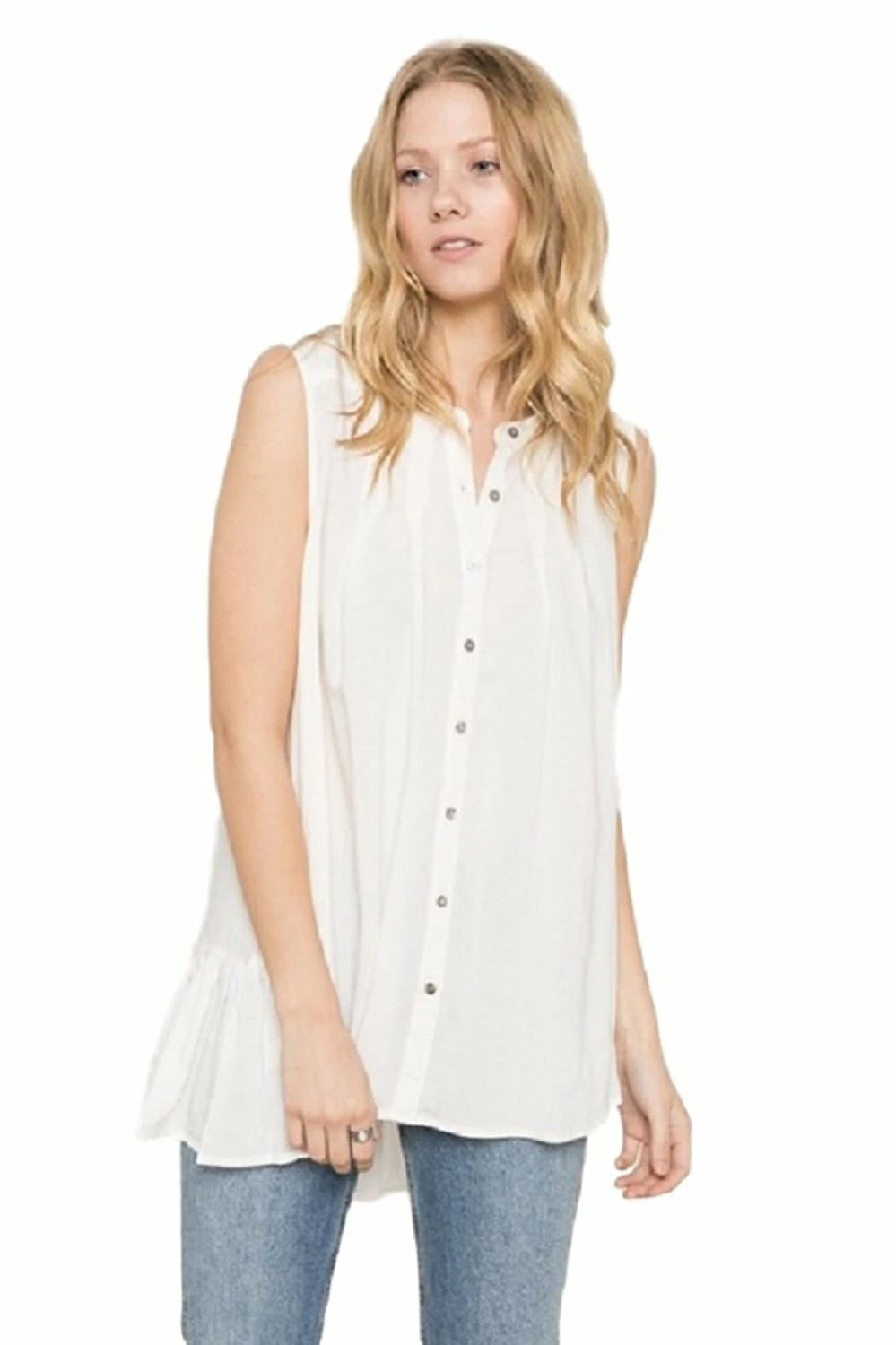 Very comfortable and elegant off-white sleeveless blouse with buttons on the front to easy access has a flowy fit with delicate ruffles on the bottom back and falls over the buttock nicely. It is also light-weight which it gives a delightful and easy way to wear to give a relaxed fit for warm weather. It has these gorgeous pleats that are located both in the front and in the back of the blouse giving it a casual but chic look. This blouse can be worn with jeans and ankle boot if you are looking for a casual look but it is also long enough to be worn with legging tights and heels if you are going for a more chic look.